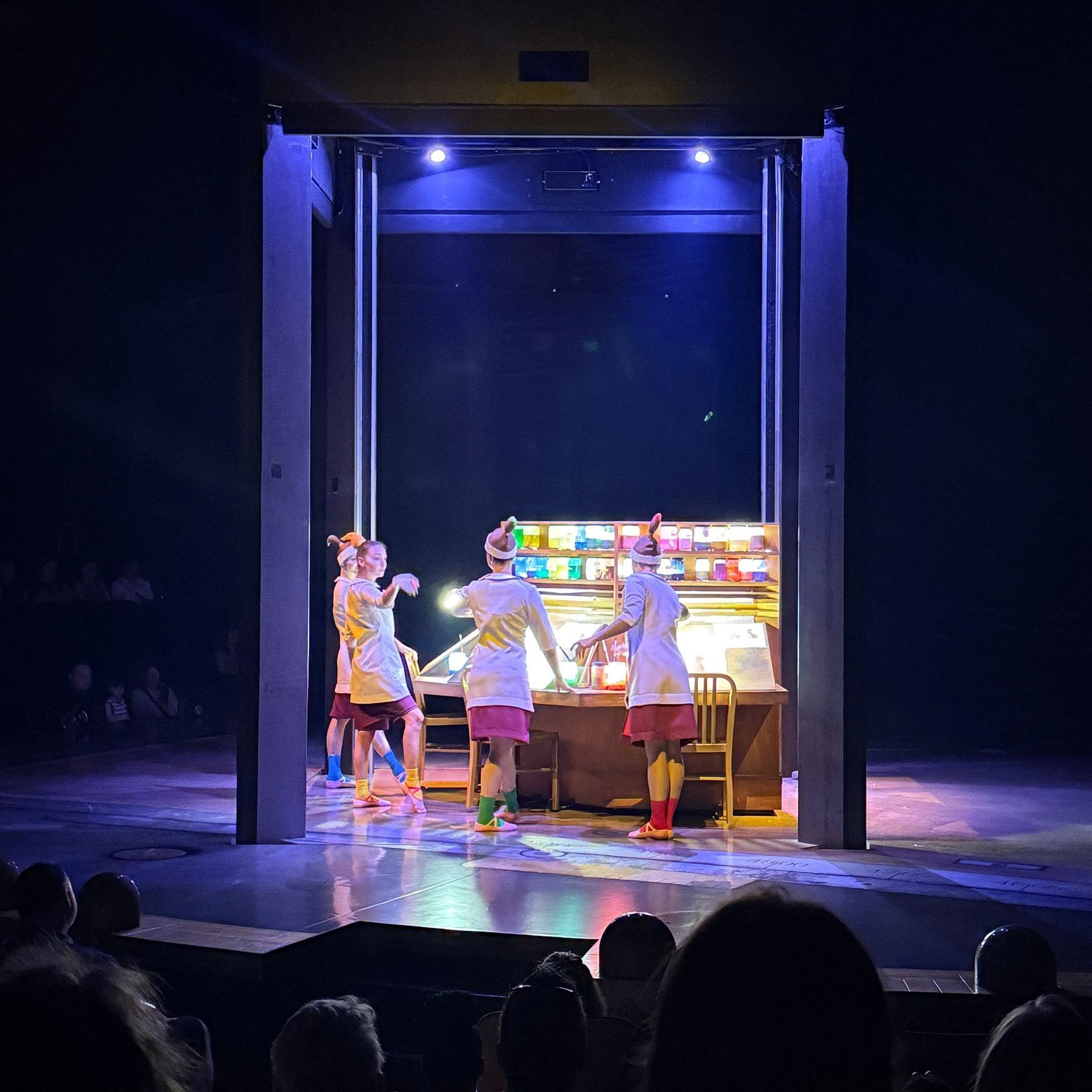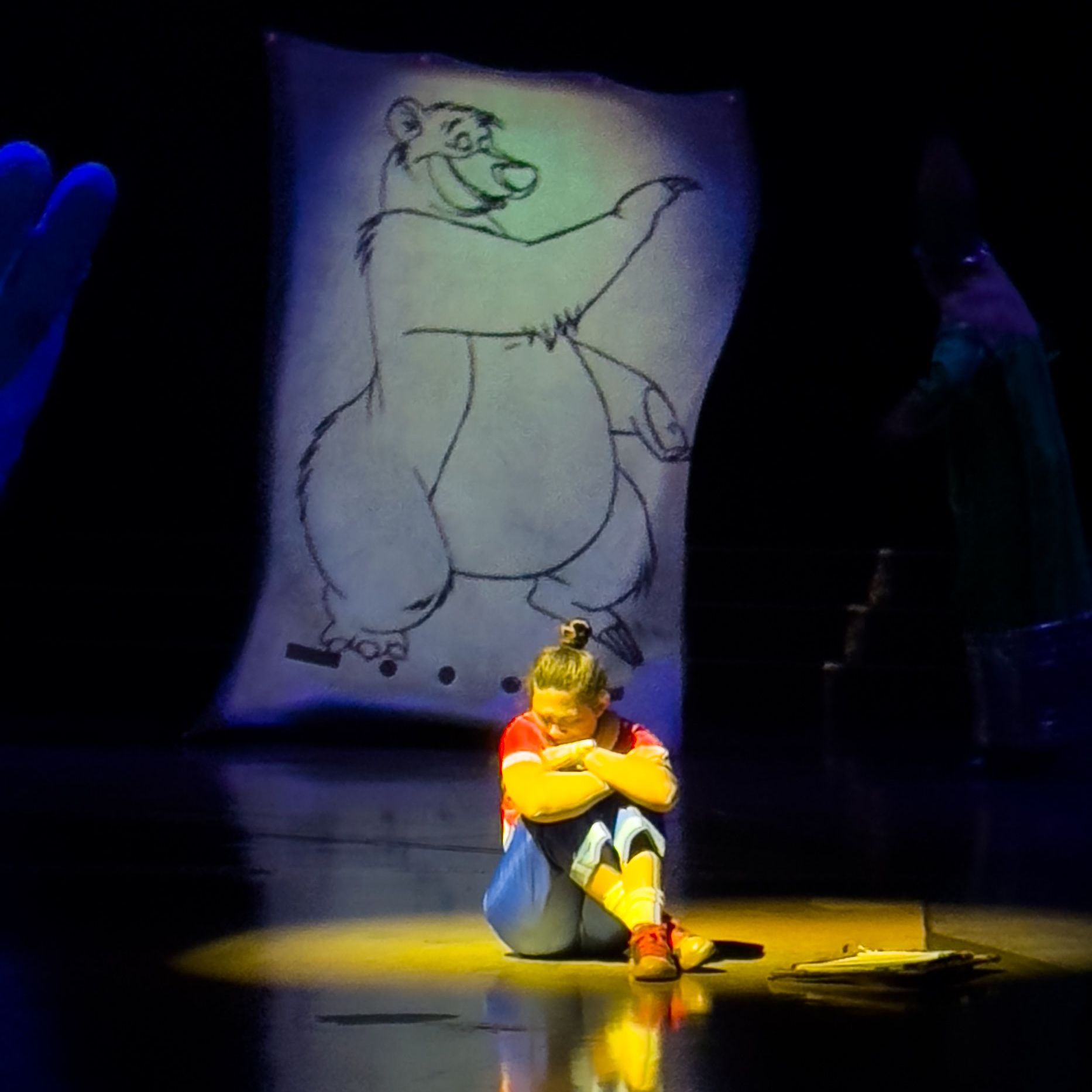 The story unfolds in an intimate theater where there truly isn’t a bad seat. Performers make their way into the aisles at times, pulling the audience even deeper into the world on stage. The set is inspired by an animator’s sketchbook, and characters appear not as costumed mascots, but through vibrant animated projections that earned plenty of oohs and ahhs from young guests.