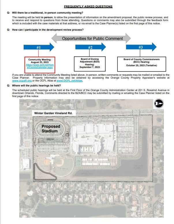 At the Horizon West Town Hall held in March 2023, District 4 OCPS School Board Member Pam Gould shared that the stadium relocation was contingent upon Orange County Board of Zoning Adjustment's (BZA) recommendation for approval as well as approval from the Board of County Commissioners (BCC).