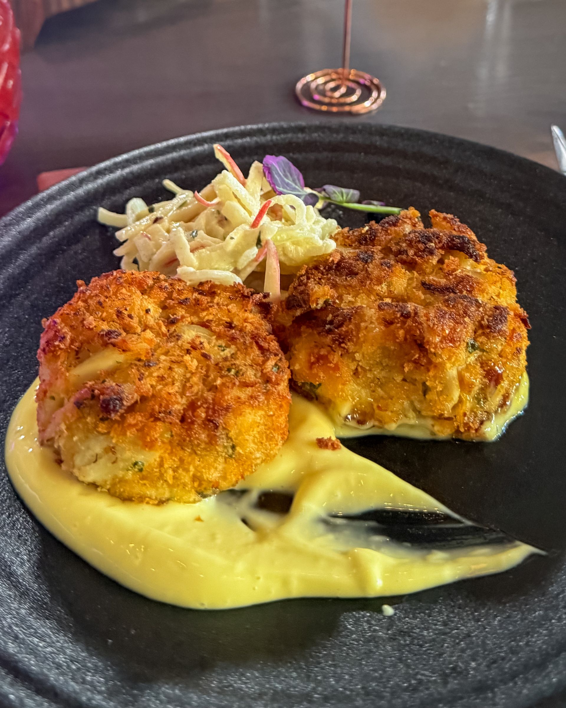 Crab Cakes arrive crisp and golden, finished with herbed breadcrumbs and paired with apple chayote slaw and a pina colada aioli that adds brightness and subtle sweetness.