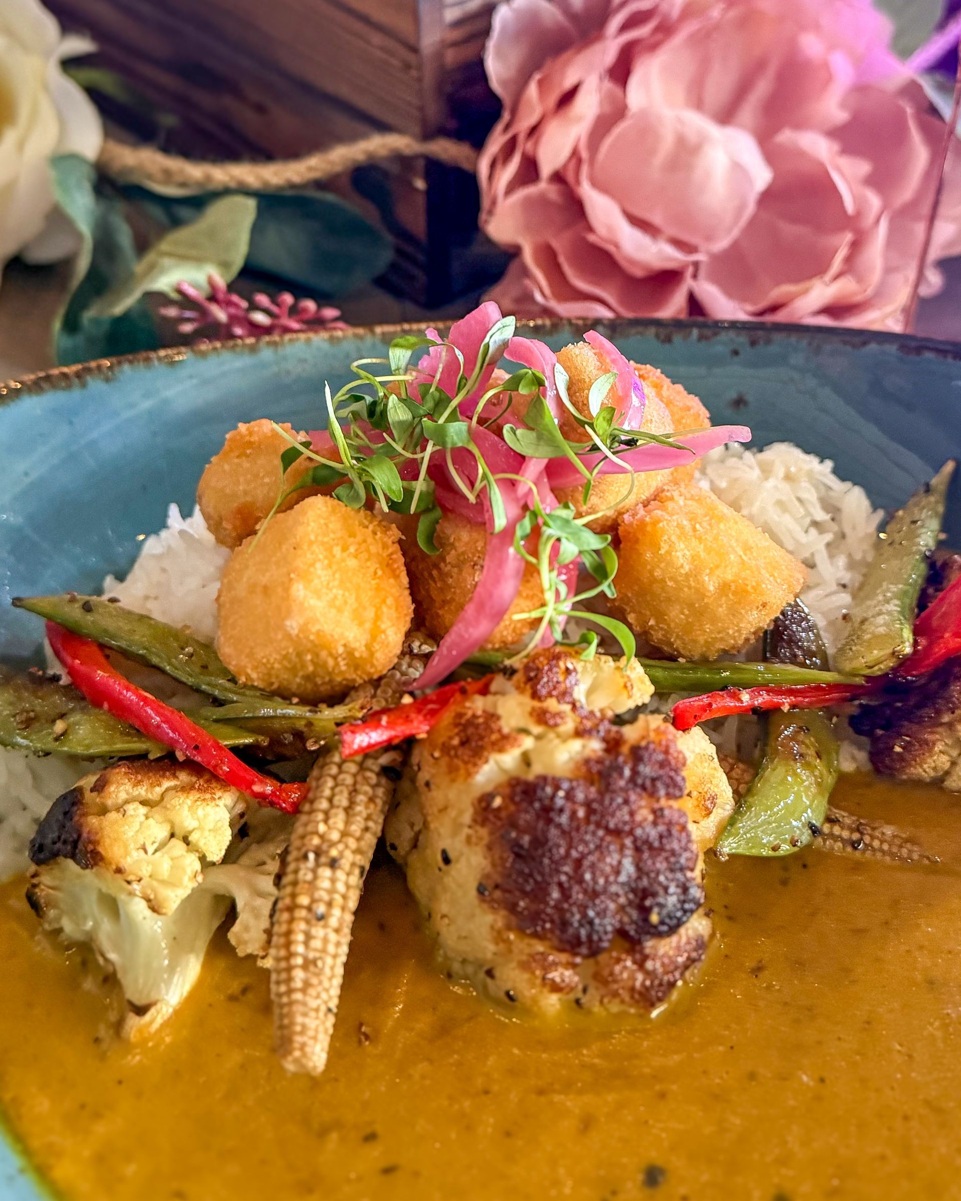 Plant-based options receive equal care. Crispy Tofu with Jamaican curry, cauliflower, coconut rice, snap peas, red peppers and baby corn proves that vegetarian dishes here are just as layered and satisfying as their seafood and meat counterparts.