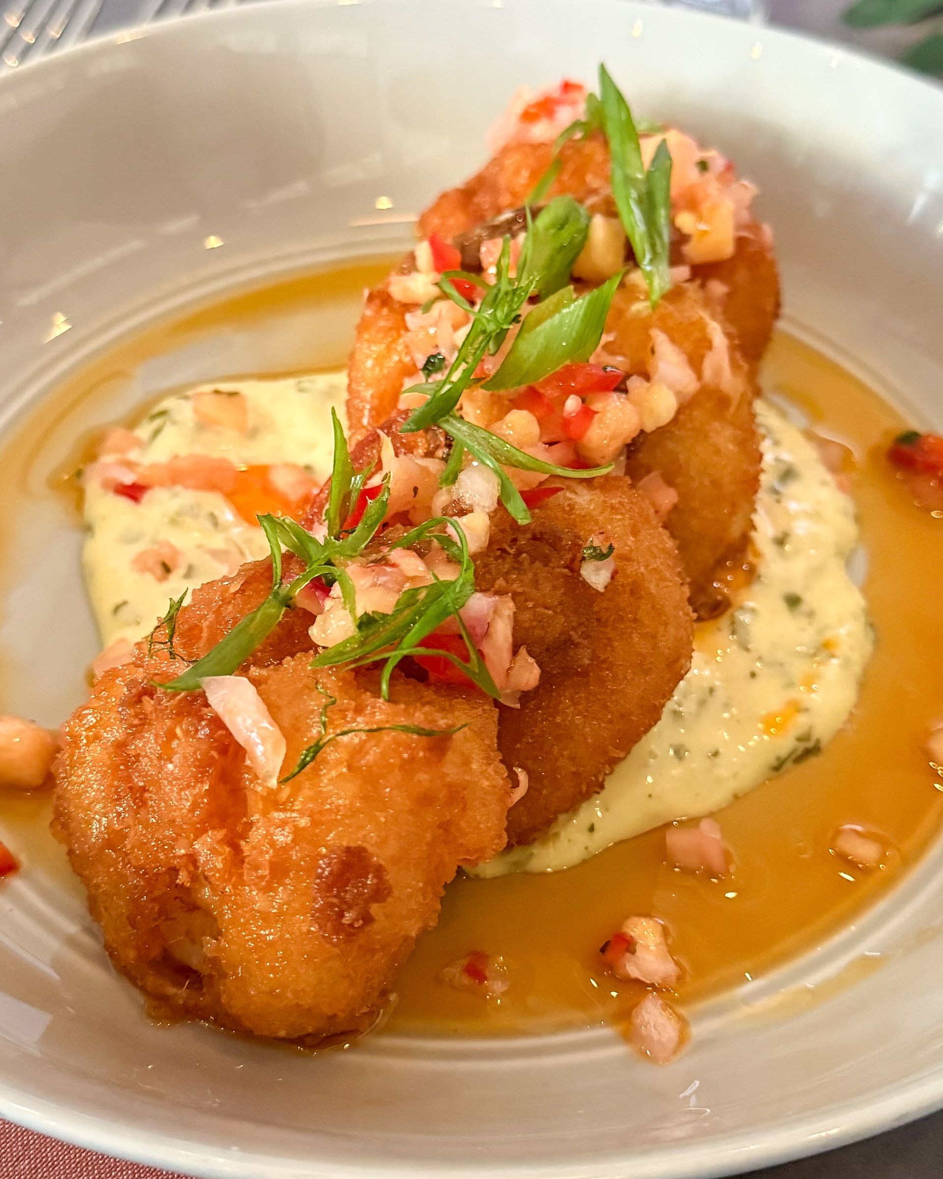 Flamingos Coconut Shrimp features local shrimp fried to a light crunch, complemented by pineapple relish, cilantro lime aioli and a drizzle of chili oil for gentle heat.