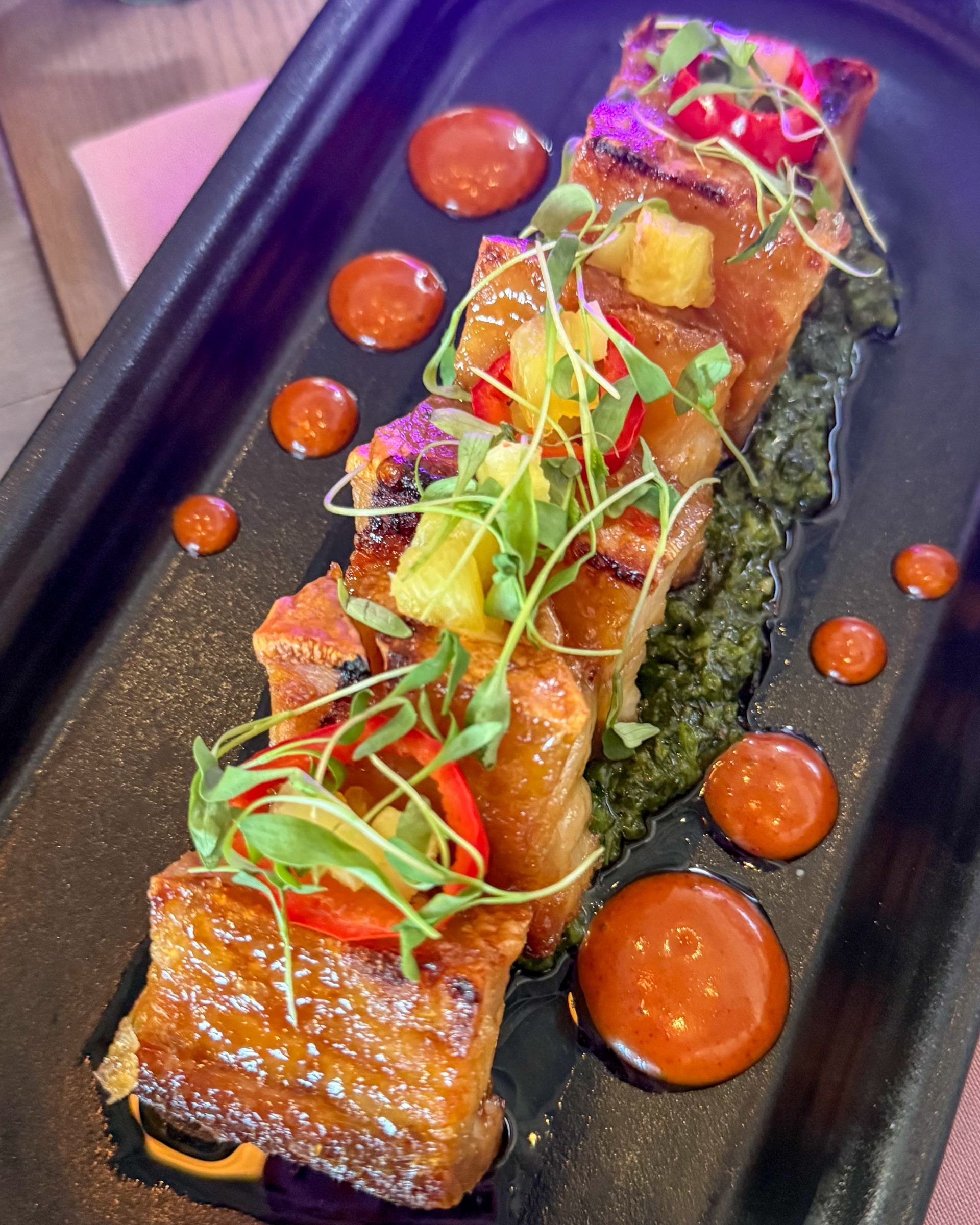 The Pork Belly is a rich and satisfying standout, glazed with pineapple rum and layered with jalapeño chimichurri, gochujang aioli and pickled pineapple and Fresno peppers. The balance of sweet, savory and spice makes it a dish that lingers in memory long after the plate is cleared.
