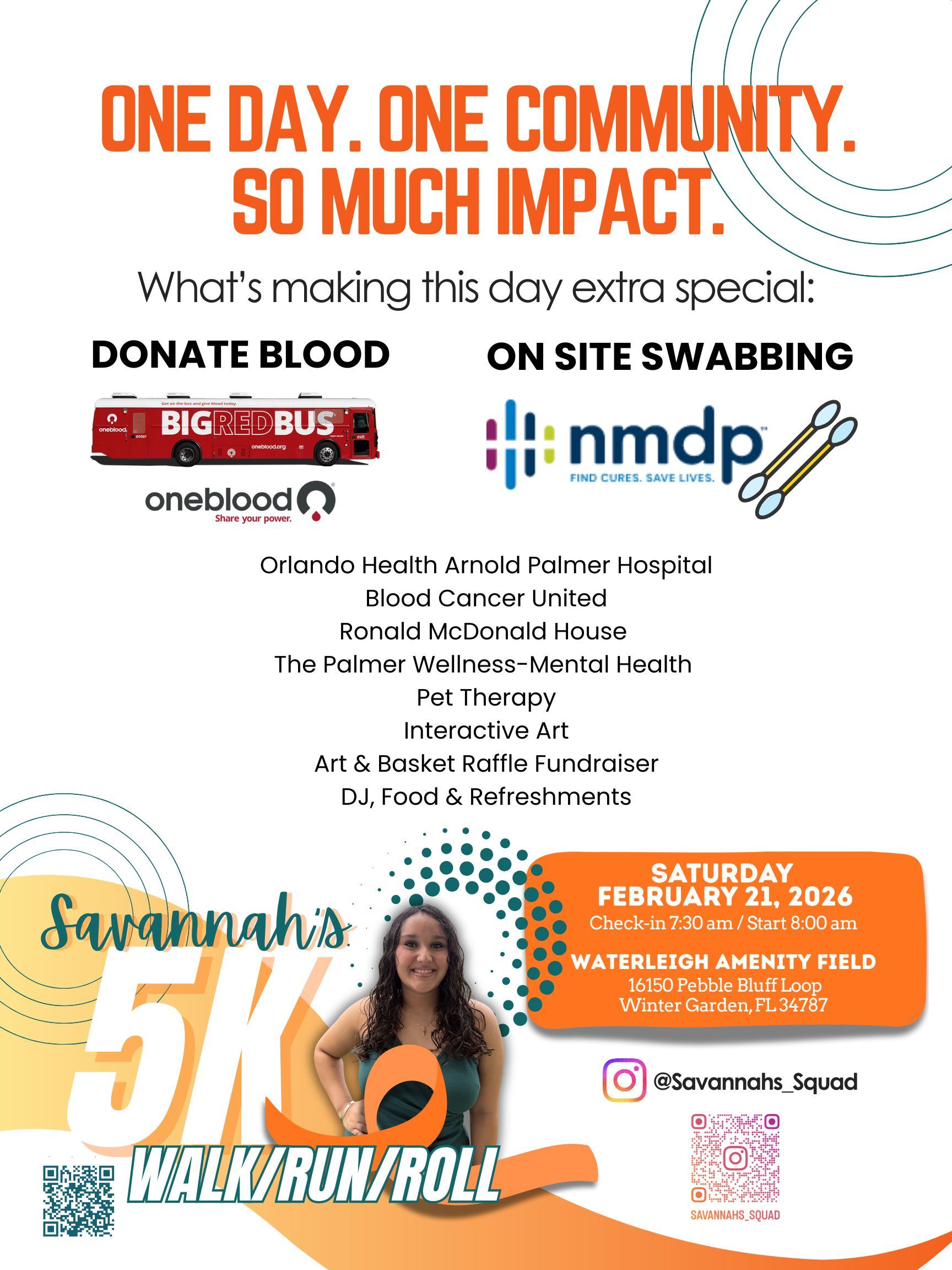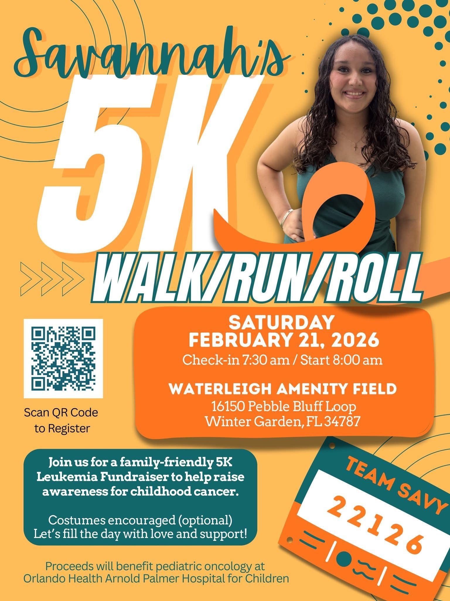 Savannah’s 5K will officially kick off on Saturday, February 21st at 7:30 am at Waterleigh Amenity Field (16150 Pebble Bluff Loop) with all proceeds going back to pediatric oncology at Orlando Health Arnold Palmer Hospital for Children and to Ronald McDonald House.