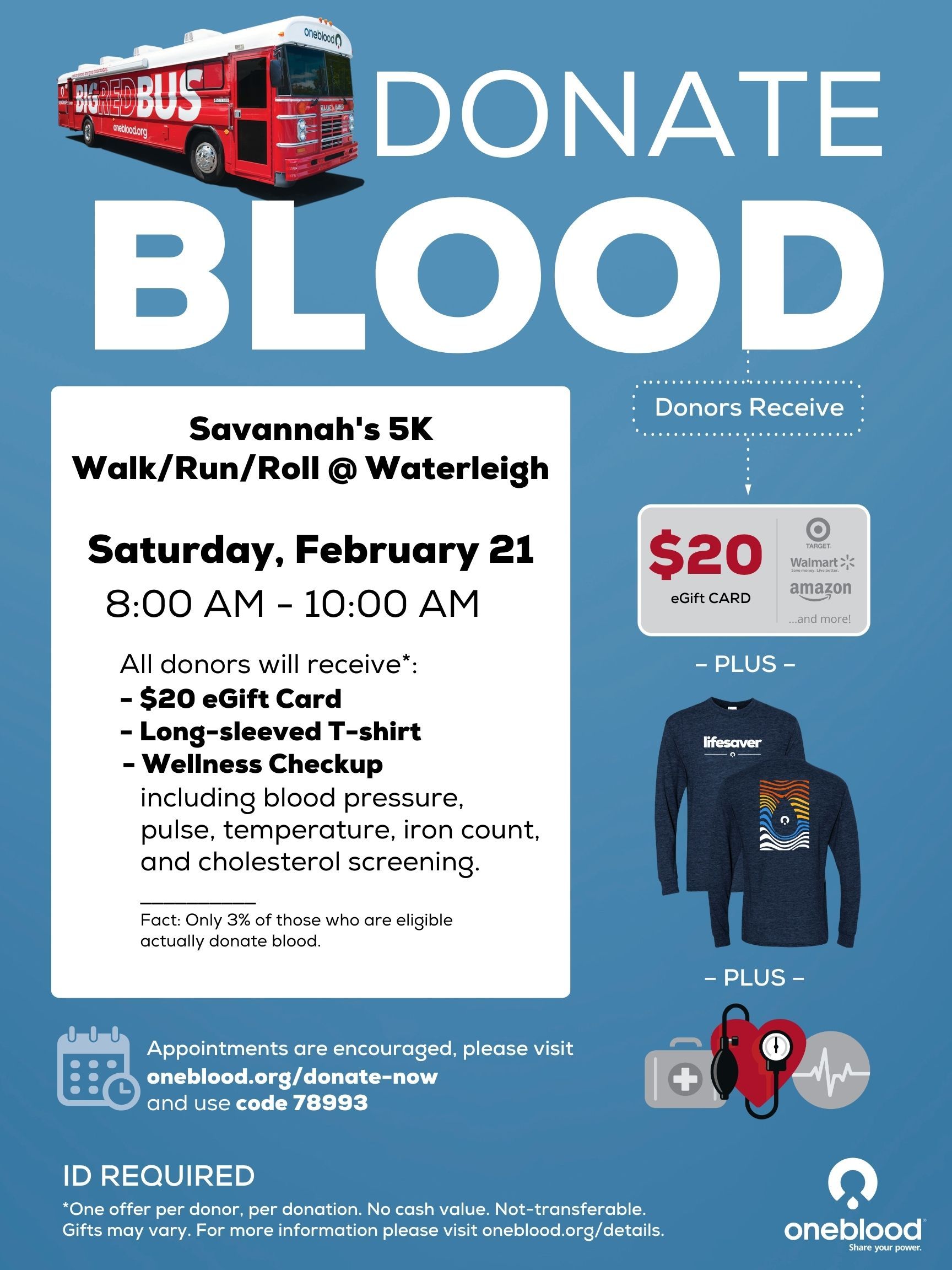 - Donate blood with OneBlood on-site and receive a $20 eGift card and a long sleeve shirt to show your contribution.